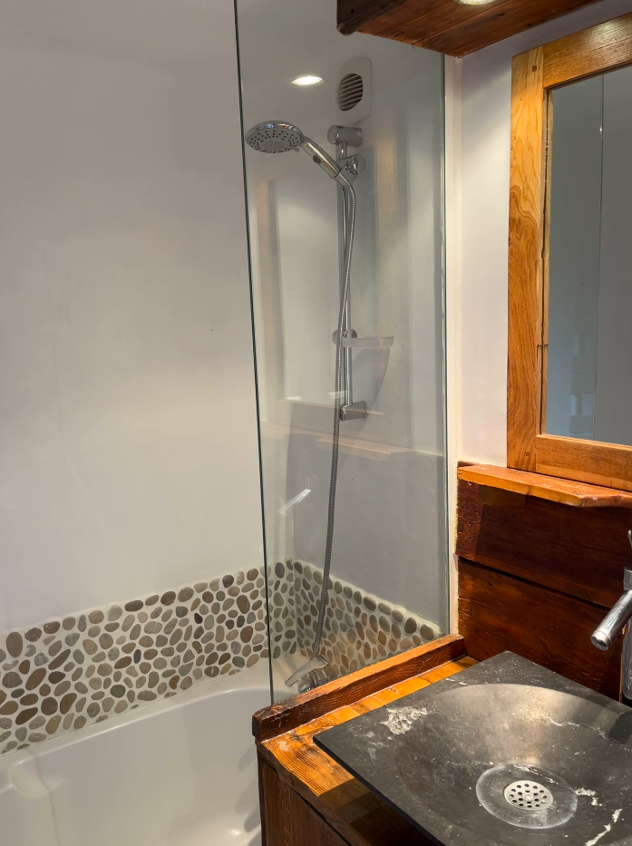 Étage 2 : Un grand séjour lumineux de 50 m², avec coin cuisine, coin repas, et salon. Un lit- canapé, dans un coin séparé du salon, est le coin apprécié par les enfants, permet aussi d’accueillir deux dormants occasionnels de courte durée.